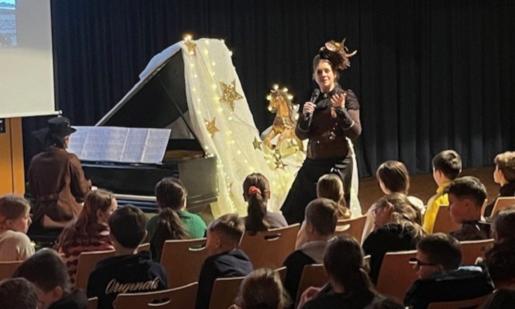 Nadine Schuster, Konzertpianistin und ehemalige Schülerin der Schule sowie die renommierte Erzählkünstlerin Alexandra Eyrich verstanden es von der ersten Minute an, die Zuschauer mit auf die Reise zu nehmen und in den Bann zu ziehen. Geschickt verbanden sie klassische Musik mit märchenhafter Erzählkunst auf lebendige Art und Weise. So wurde der Auftritt teilweise zum „Mitmach“-Theater.