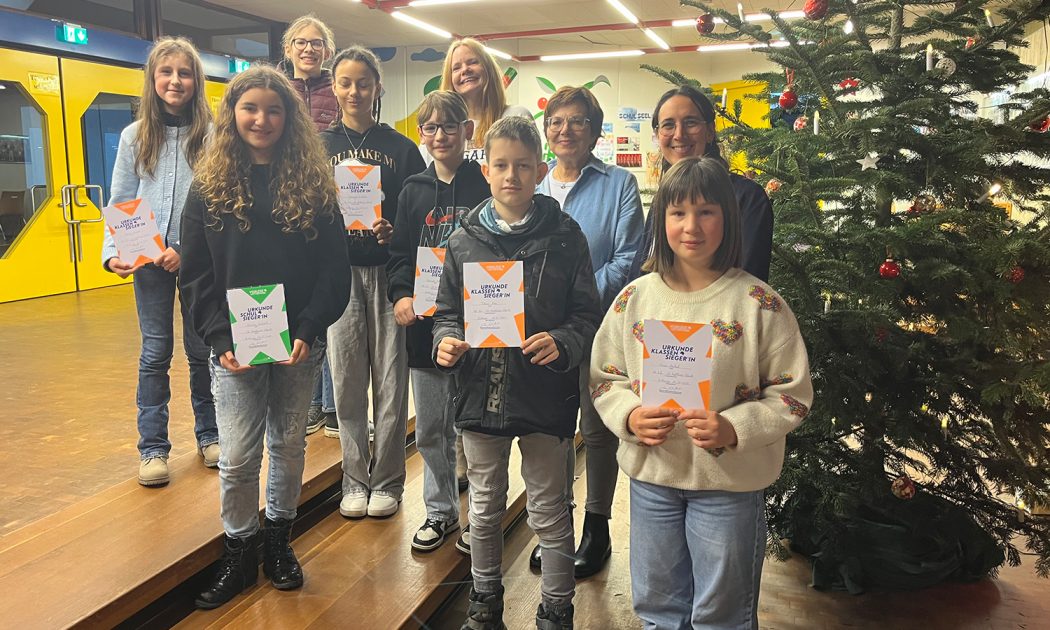 Am letzten Schultag vor den Weihnachtsferien wurden die Klassensieger*innen und die Schulsiegerin im Rahmen der Mätthi-Weihnachtsfeier der ganzen Schulgemeinschaft vorgestellt und offiziell geehrt. Ihnen wurden jeweils eine Urkunde und Schokolade für den Klassensieg überreicht; zusätzlich zur Urkunde des Schulsiegs erhielt Lorena noch einen Gutschein der Buchhandlung „Logos“ und einen von der Buchhandlung spendierten Buchpreis. Zum Abschluss versetzte sie uns alle noch durch das Vorlesen eines eigens für die Weihnachtsfeier geschriebenen Textes in Weihnachtsstimmung. Vielen Dank allen mutigen und engagierten Leser*innen!